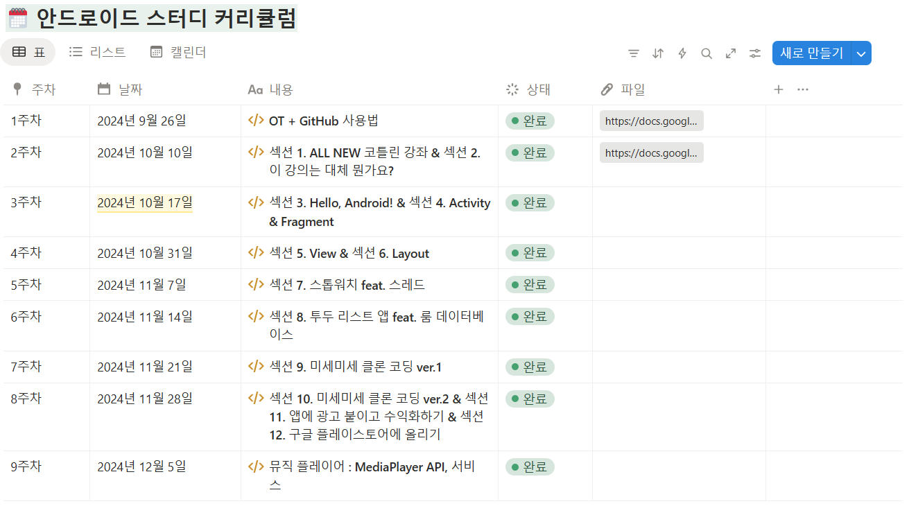 부서마다 스터디 진행 방식이 상이했고, 내가 속한 안드로이드 부서는 다음과 같은 커리큘럼으로 스터디를 진행했다.